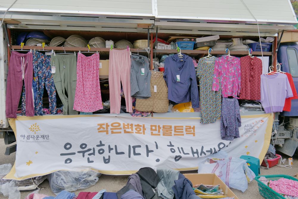 5일 동안 ‘작은변화 만물트럭’은 경북 영덕의 마을회관, 경로당, 모텔, 면사무소 등 총 17곳을 찾아가며 850여 명의 이재민을 직접 만났습니다. 트럭에는 다양한 색상과 사이즈의 옷, 속옷, 양말 등 필수 의류가 가득 실려 있었고, 이재민분들은 각자의 필요와 취향에 맞춰 물품을 고를 수 있었습니다.