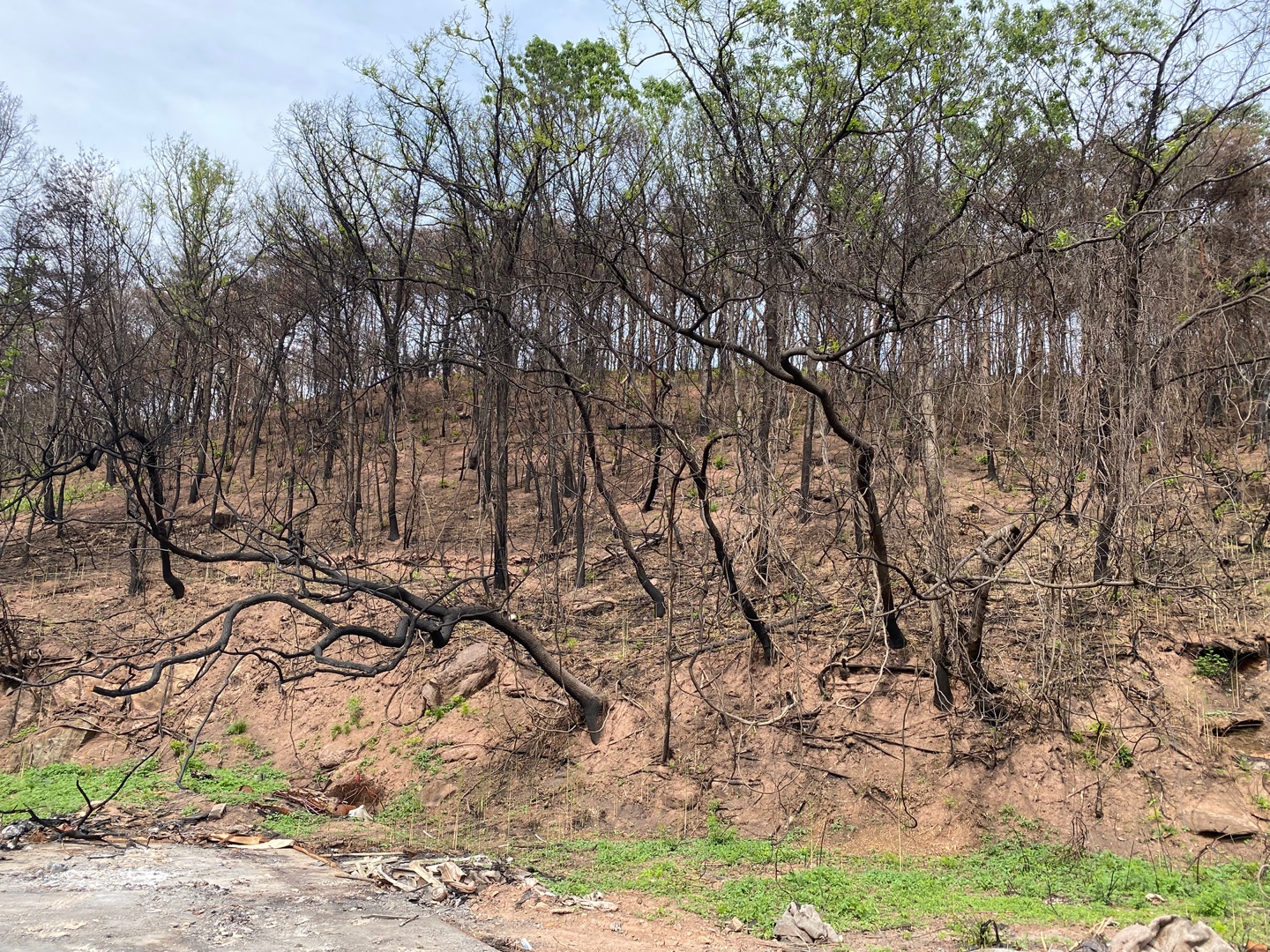 산속으로 조금 더 들어가자, 갑자기 도로 양옆으로 새까맣게 그을린 나무들이 나타났습니다. 산불이 났을 당시에는 이 길조차도 통행이 불가능했겠구나 싶어, 그 현장에 없었던 저조차도 순간 두려운 마음이 들었습니다. |