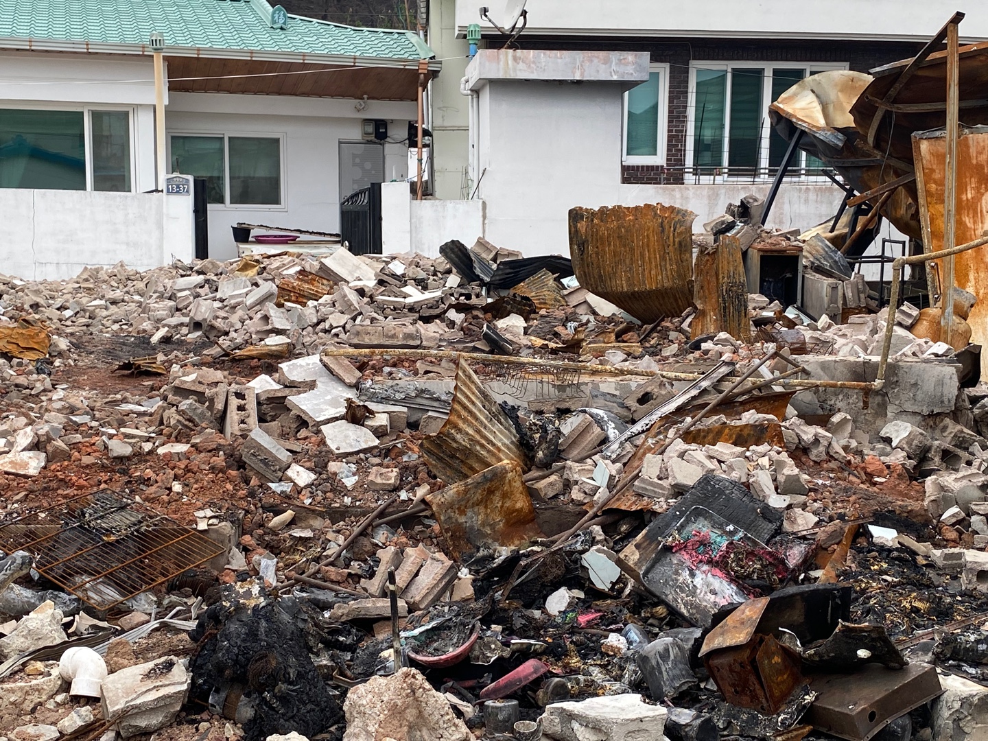 주택들이 빼곡히 들어서 있고 골목도 좁아, 중장비가 들어가기 어려운 구조 탓에 화재 발생 후 지금까지도 잔해를 제대로 치우지 못하고 있었습니다. 하수도 문제인지, 주변에서는 불쾌한 냄새도 났습니다.