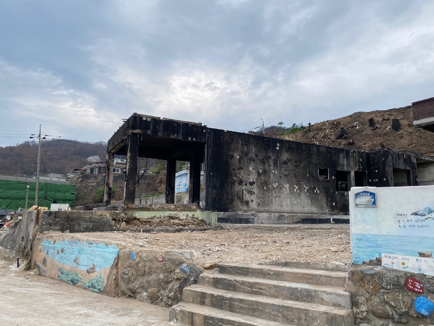그 후, 모텔에서 생활 중인 한 어촌출신인 여성분의 집이 있었던 자리로 향했습니다. 그분은 어부이자 식당을 운영하던 분이었지만, 산불로 인해 집도, 그물도 모두 불타버렸다고 합니다.