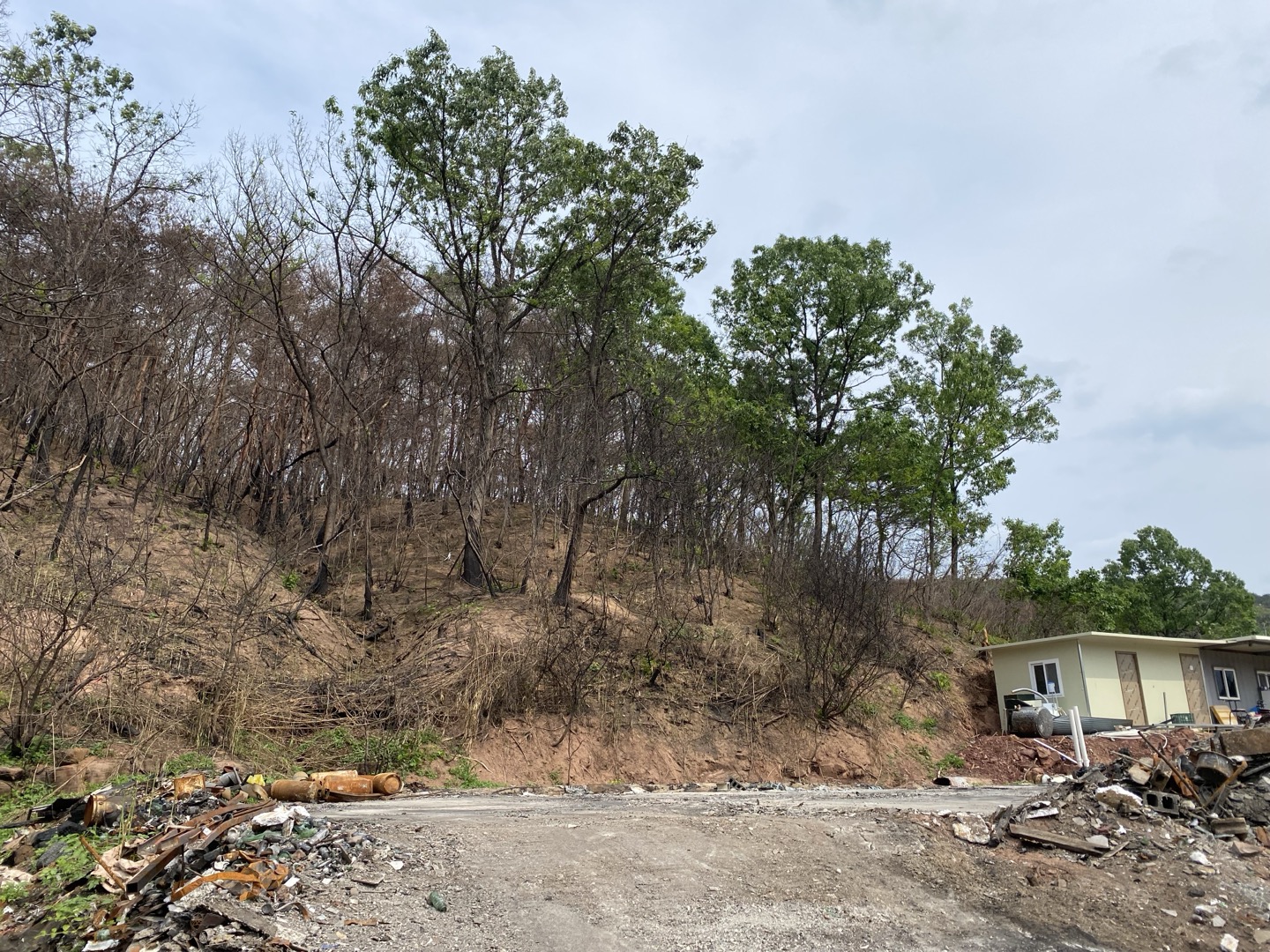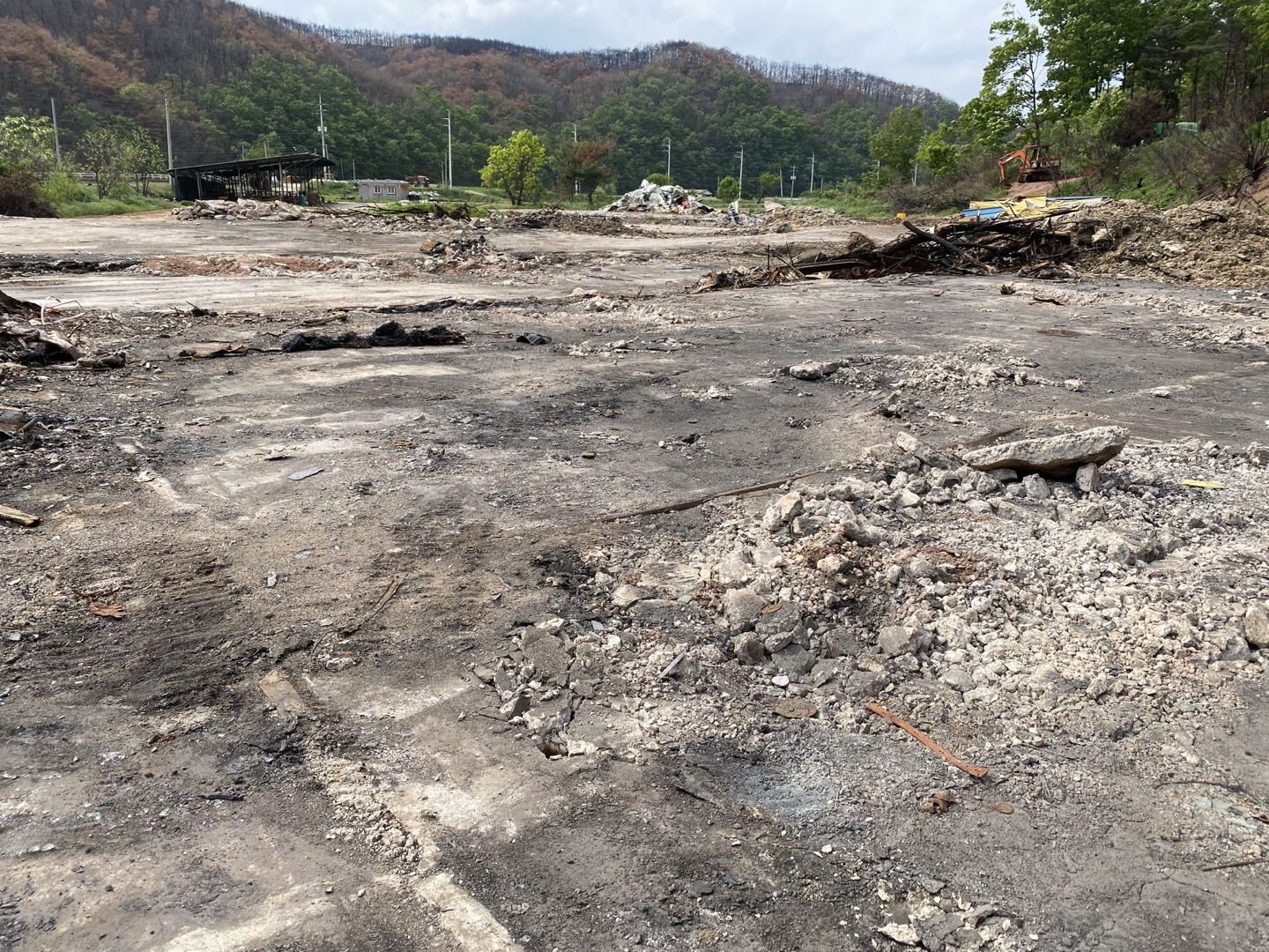 우리가 당시 만나기로 한 장소는 불타버린 농장 앞에 세워진 작은 컨테이너였습니다. 주변은 온통 검게 탄 들판, 타다 남은 잔해, 그 사이를 지키는 몇 마리의 소와 닭, 개들뿐이었죠. 그런데 이장님, 생각보다 훨씬 밝은 얼굴로 나타나셨습니다.