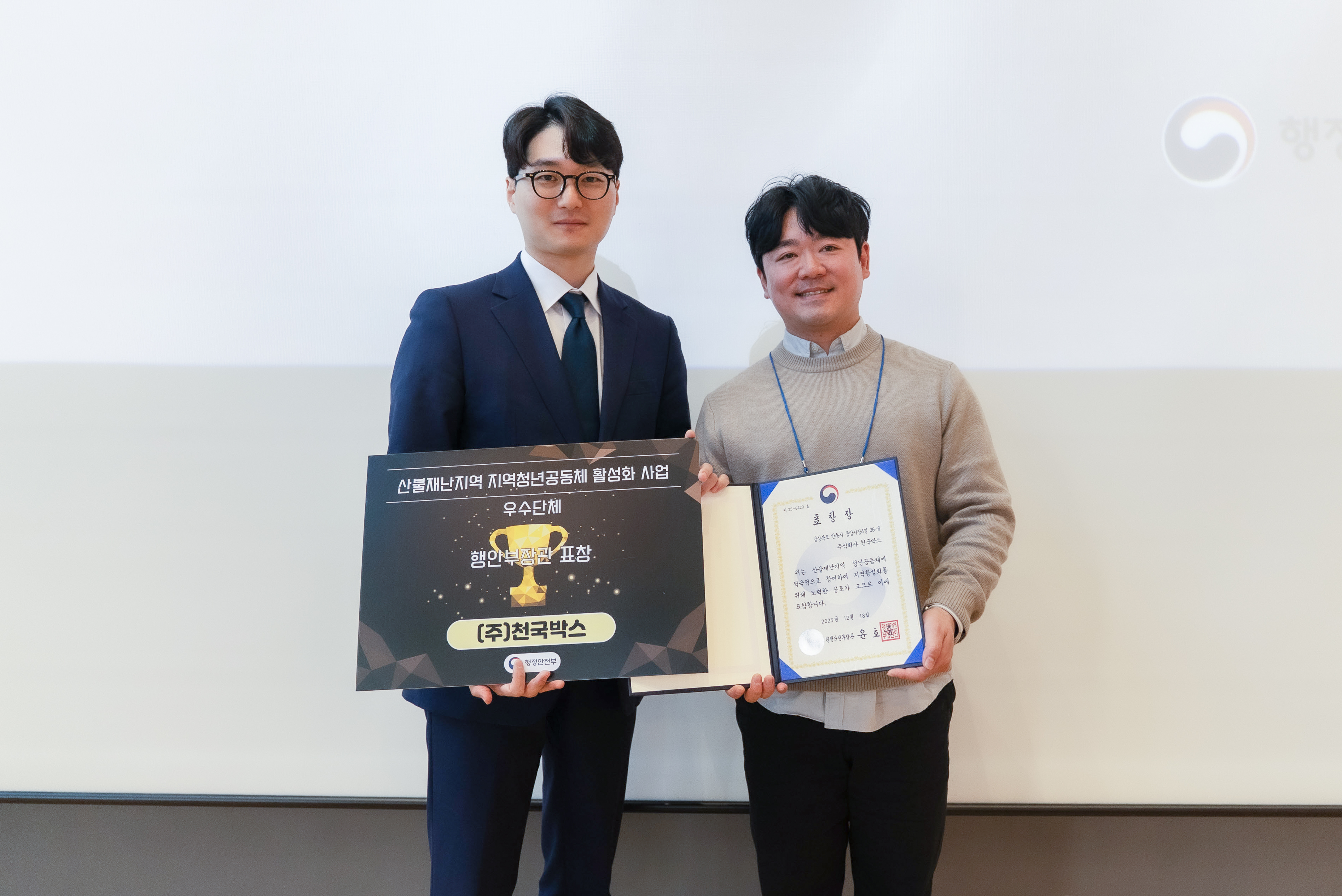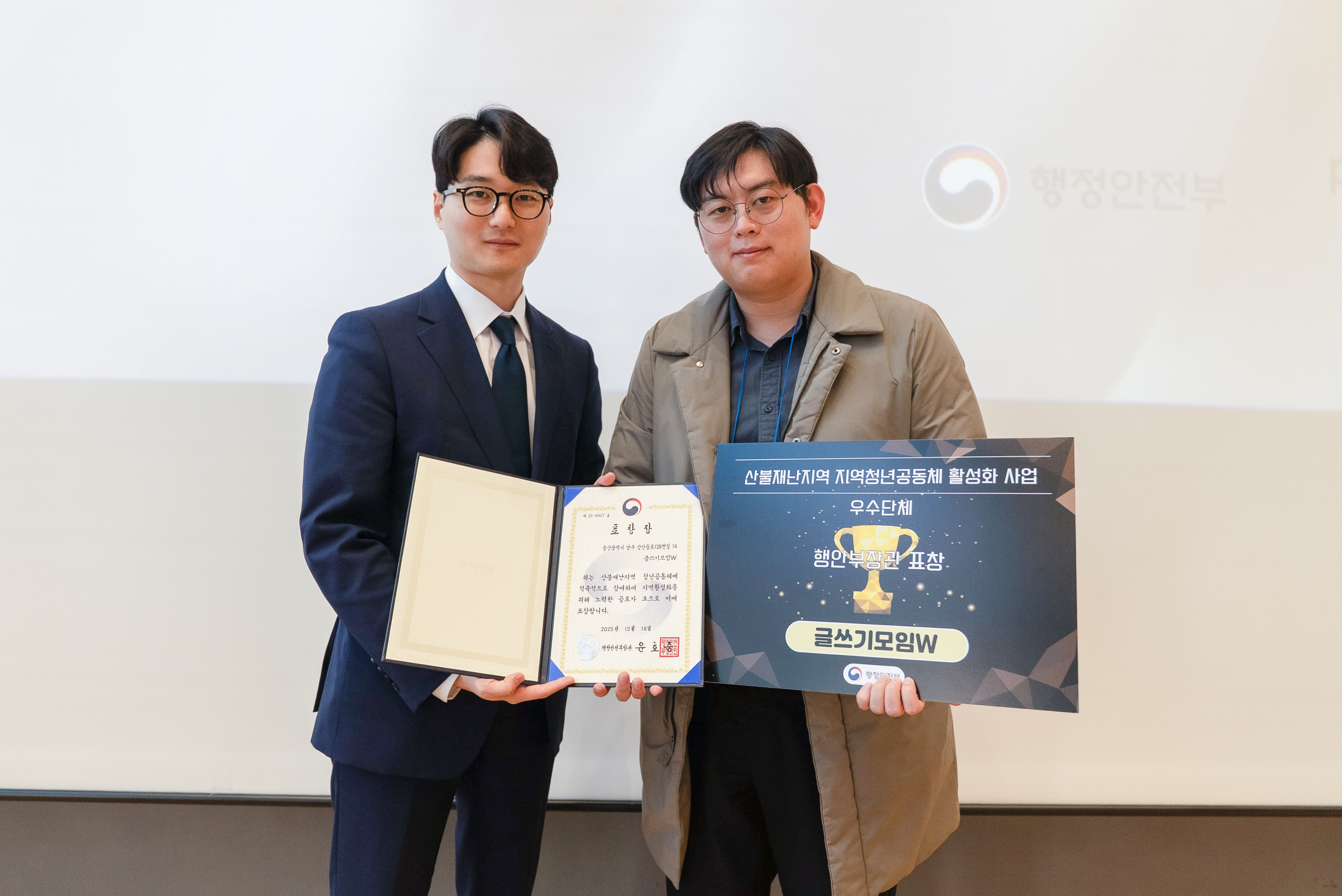 행안부장관 표창을 받은 단체는 울산 울주의 '글쓰기모임W' , 안동의 '(주)천국박스', 안동의 '로컬그라피오월' 이었어요. 누구보다 성실하게 재치 있고 실용적인 활동으로 재난 지역 마을을 회복하고 커뮤니티를 재건하는데 앞장선 훌륭한 청년단체들이었죠. |