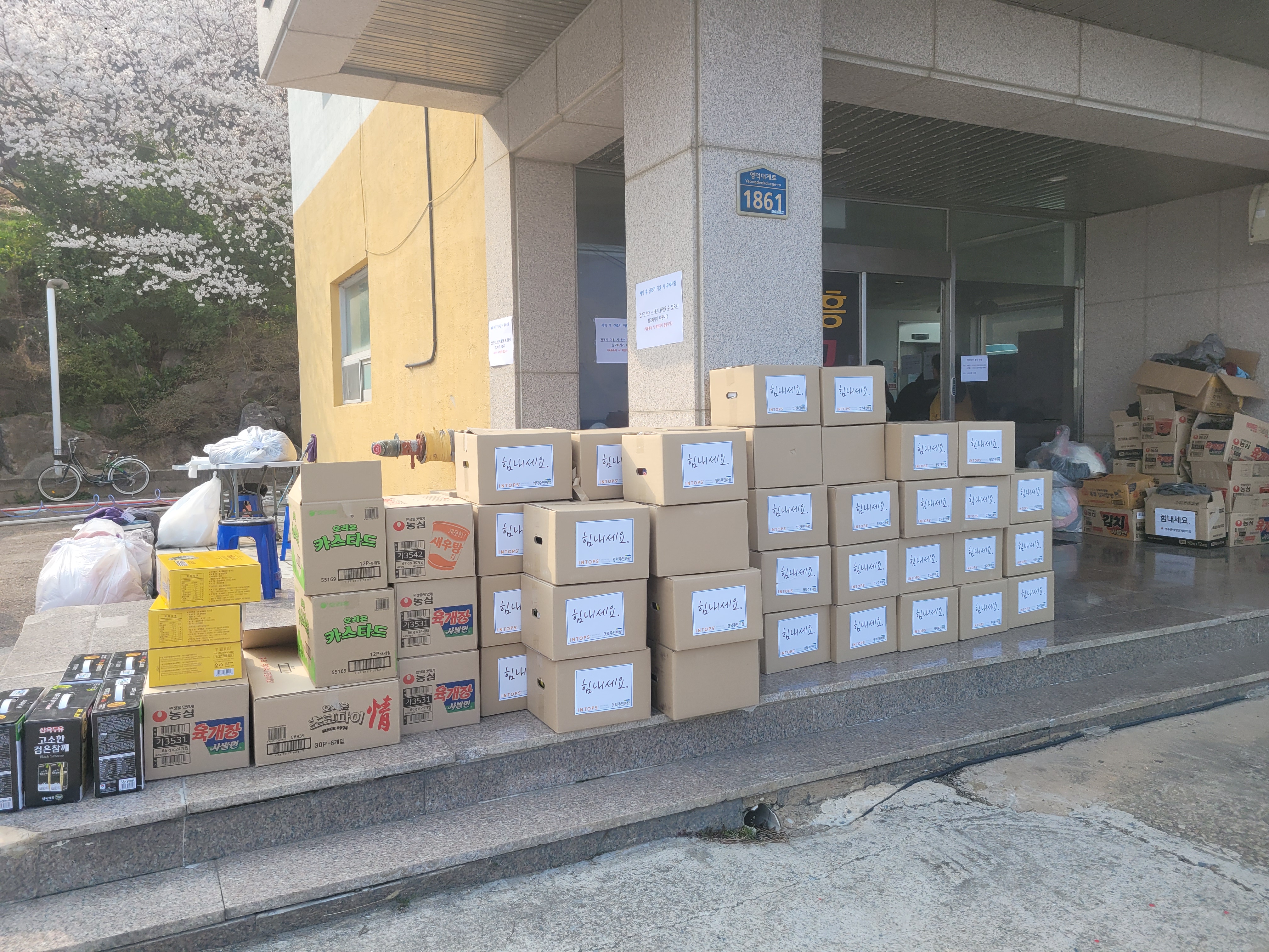 대피소 앞에 쌓인 구호 물품 (영덕군, 2025년 4월)