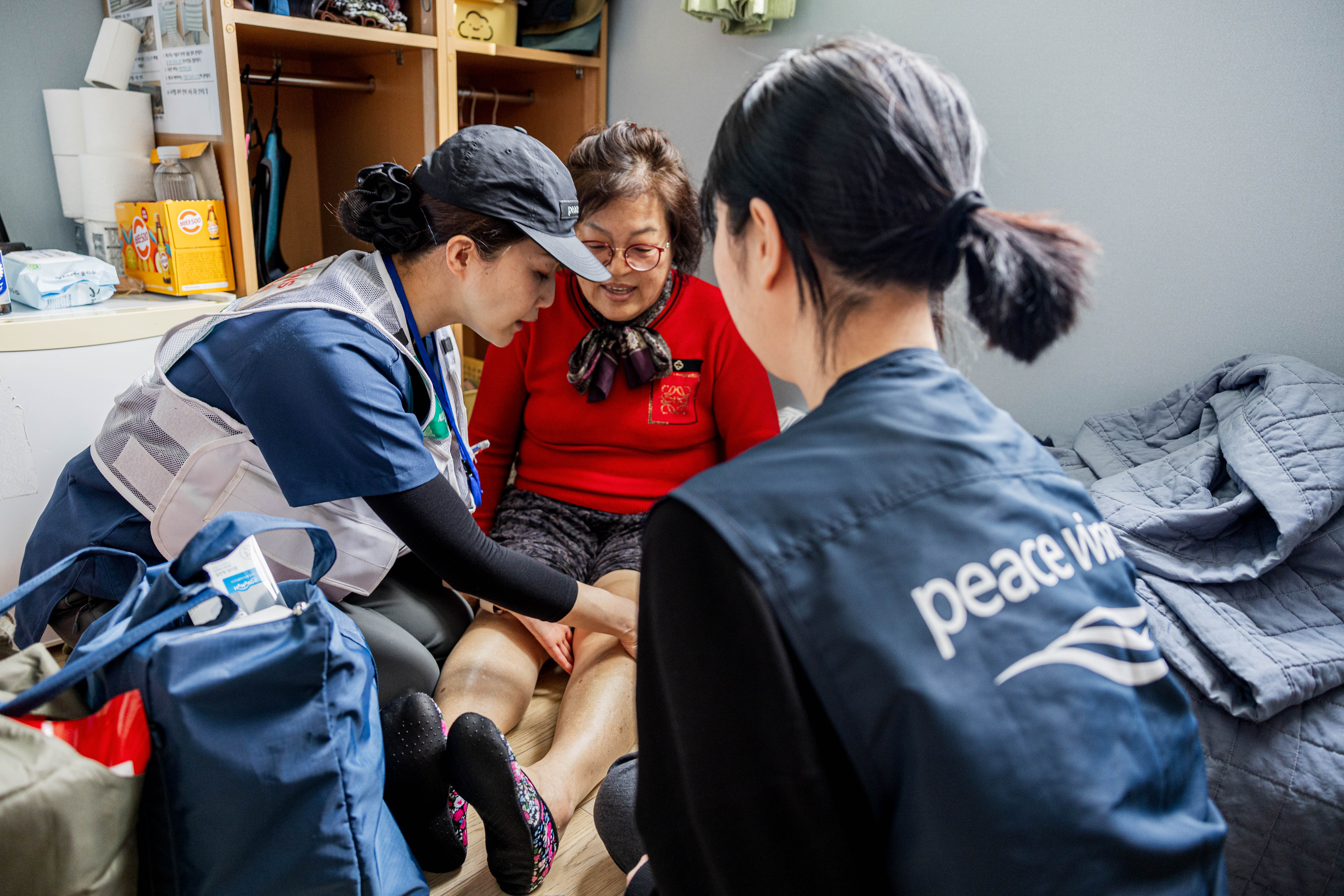 3월 27일부터 간호사를 포함한 피스윈즈 국제긴급지원팀이 한국팀과 합류했습니다. 영덕군에서 대피소로 지정된 국립해양청소년센터에서 간호사가 방마다 이재민들을 방문해 필요한 물품을 전달하며 이야기를 나누자, 이재민으로부터 건강에 대한 고민이 속속 들려왔습니다. 불안감에서 비롯된 불면증, 어깨나 허리의 뻐근함, 지병으로 인한 부기 등 증상이 나타나고 있었습니다.